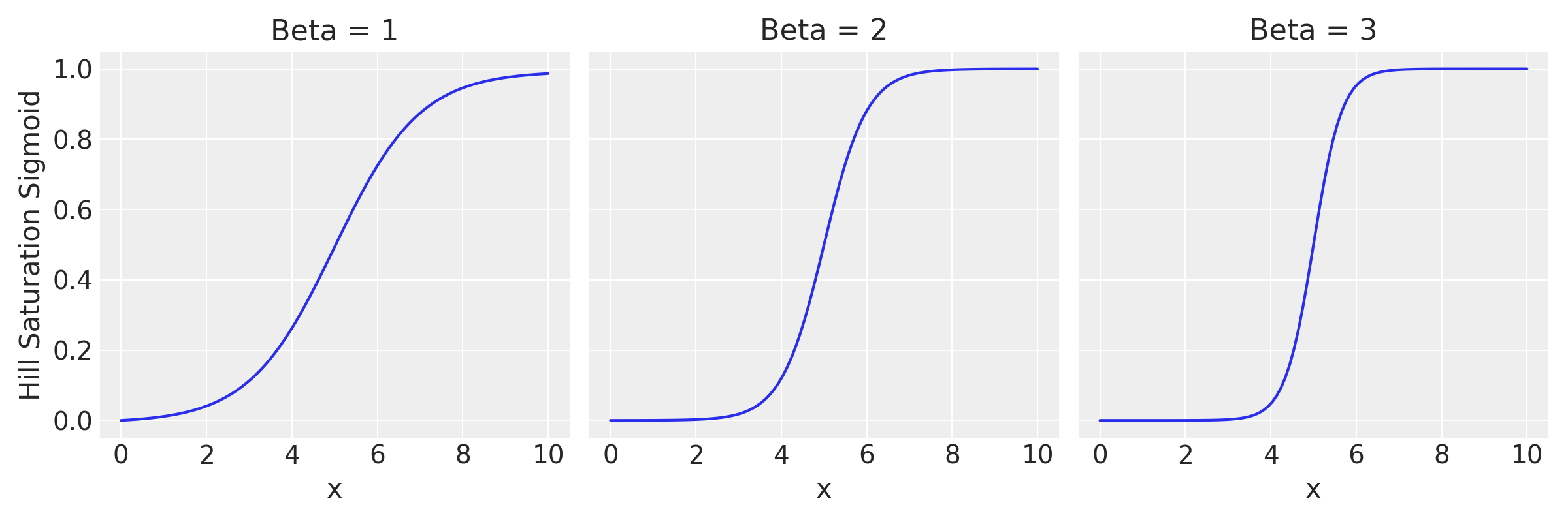 This function computes the Hill sigmoidal response curve, which is commonly used to describe the saturation effect in biological systems. The curve is characterized by its sigmoidal shape, representing a gradual transition from a low, nearly zero level to a high plateau, the maximum value the function will approach as the independent variable grows large. In this implementation, we add an offset to the sigmoid function to ensure that the function always passes through the origin as we expect zero spend to result in zero contribution.