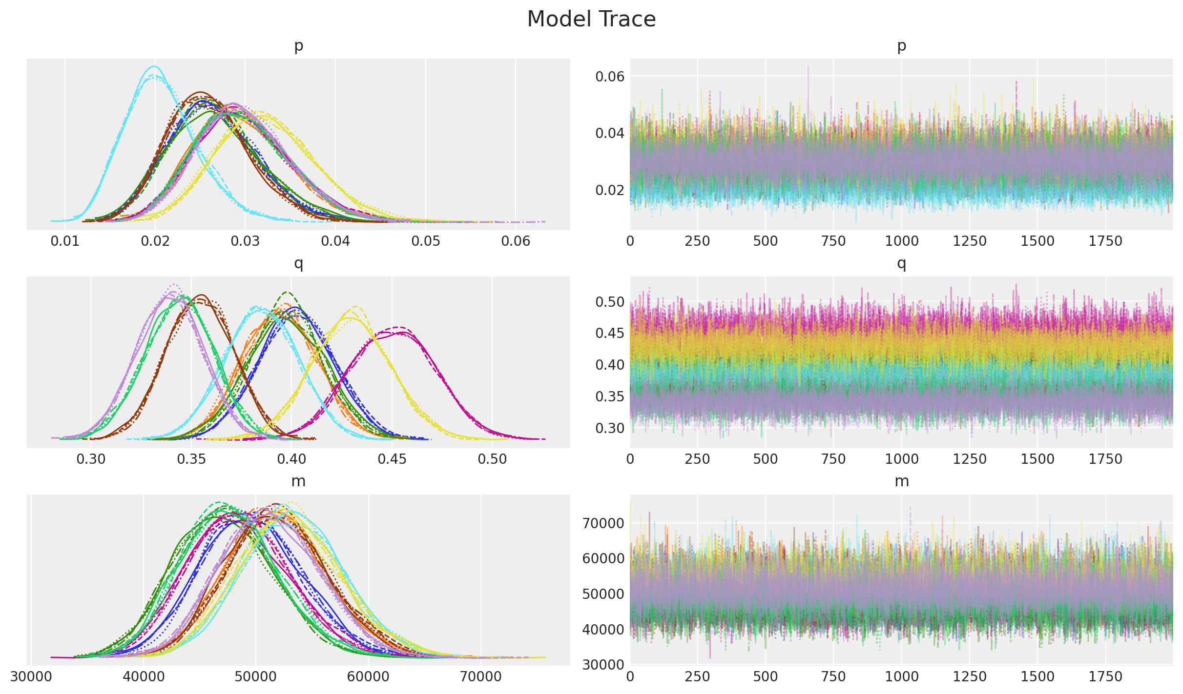The total number of adopters over time is the sum of innovators and imitators, which equals \(\text{adopters}(t)\). All of these components are directly implemented in the PyMC model, allowing us to analyze each aspect of the diffusion process separately.