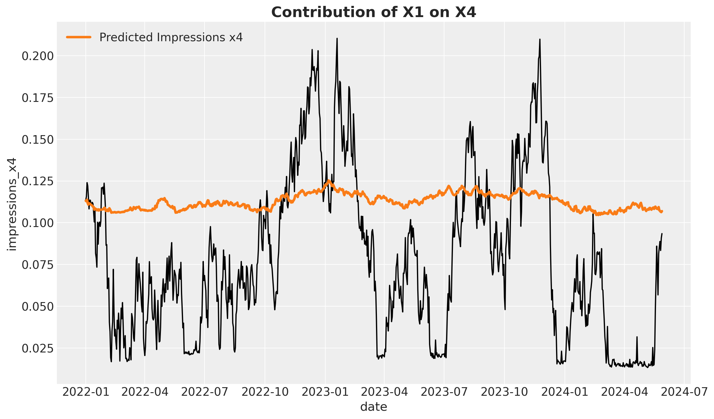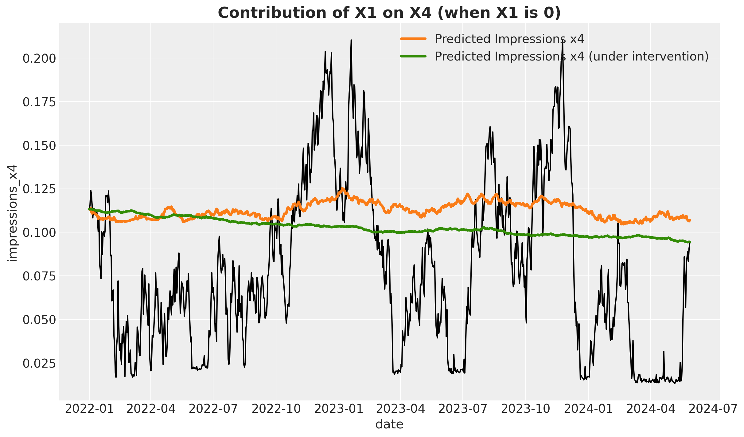 impressions_x1 = 0and computeimpressions_x1_diffPredict counterfactual X4: Use the mediation model to predict what X4 would have been without X1